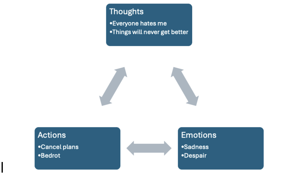 Notice the arrows point in both directions, because each of these domains (thoughts, actions, emotions) can influence each other. For some people, depression might first start with diminished activities, which then leads to low mood and negative thoughts. For others, negative thoughts may lead to negative moods, which then results in diminished activity. The treatment of depression from a CBT lens involves intervention in each of the thoughts, moods, actions layer of the model. For many, changing behavior is a good starting point, but there is much that can be done for intervening at each level of the CBT depression model.